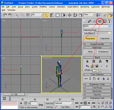 Remember that Character Studio is a max plugin and in most respects, it is pretty much a different software altogether. Thus, some of the workflow is very different from max. Click on any body part of the Biped character, then click on the Motion tab. This will open up the Biped parameters. You can then access the Open folder icon to open up the motion capture files of your choice.